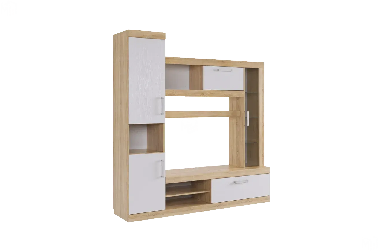 Состоит из: место под телевизор, витрина со стеклом, 4-ре шкафа с дверцами, открытые полки для аксессуаров, ниши под аудио-, видеотехнику.