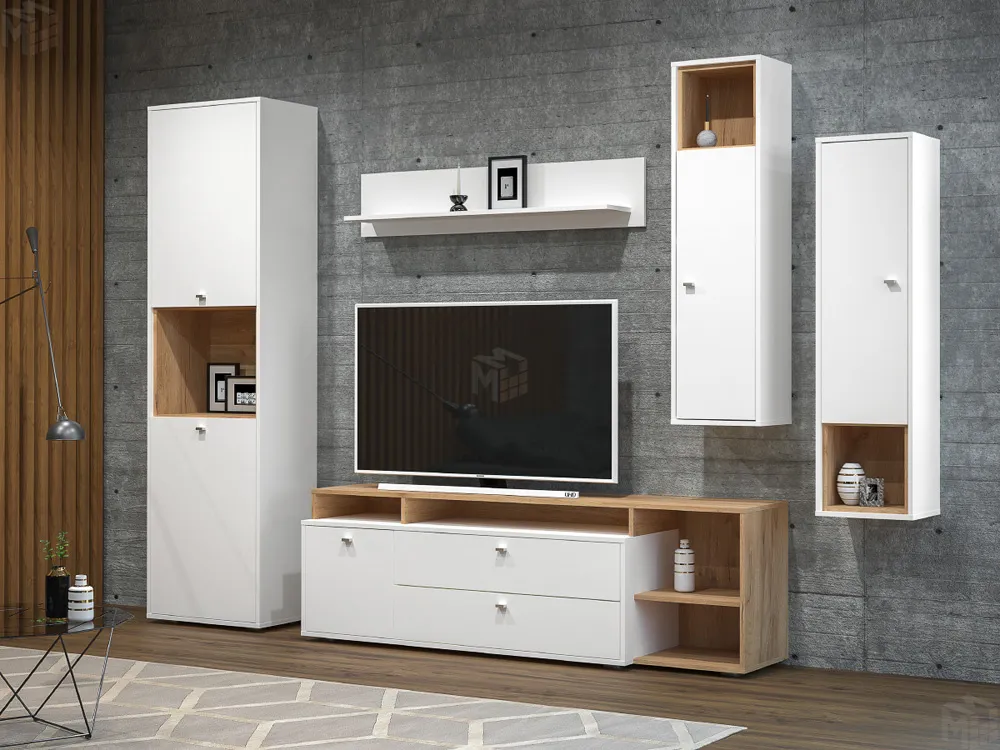 Гостиная модульная система сочетает в себе актуальные цвета и функциональную геометрическую форму с мотивами конструктивизма.