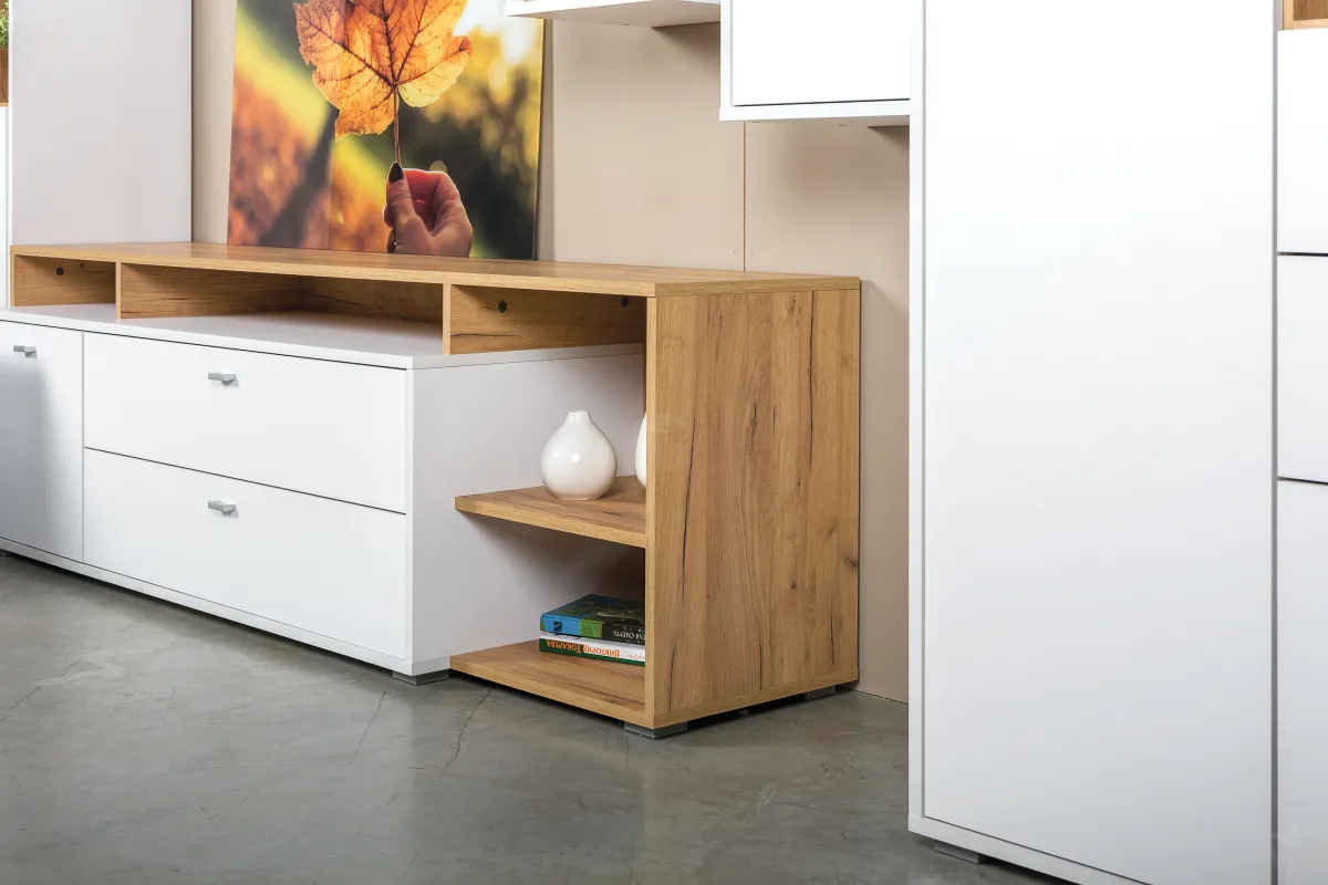 Гостиная модульная система сочетает в себе актуальные цвета и функциональную геометрическую форму с мотивами конструктивизма.