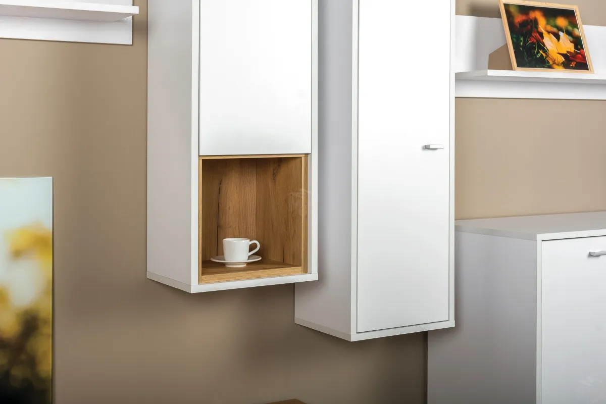 - шкаф навесной Бэль 10.63 - Ш320 х Г270 х В1204 мм - 2 шт.Гостиная Бэль (вариант 2) поможет создать уютную и современную обстановку в вашей гостиной. Теперь у вас будет уютная комната, в которой вы сможете проводить свободное время со своей семьей или друзьями. За распашными дверцами шкафов находятся полки, созданные для бережного хранения различных предметов, в том числе одежды. В открытых нишах и на навесной полке будут гармонично смотреться интересные и увлекательные книги, семейные фотоальбомы, коллекция интересных предметов, оригинальные сувениры, статуэтки, детские поделки и многое другое. Тумбу можно использовать в качестве подставки под телевизор для более комфортного просмотра новостей, сериалов и различных телепередач.