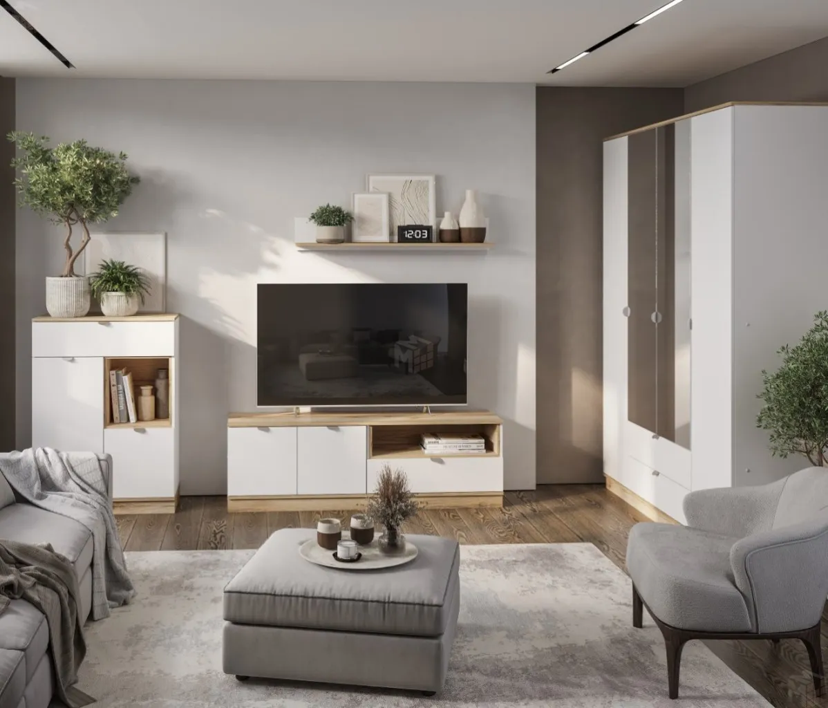 Модульная гостиная "Юкки комплект-1" изготовлена из ЛДСП в цвете белый/дуб делано.