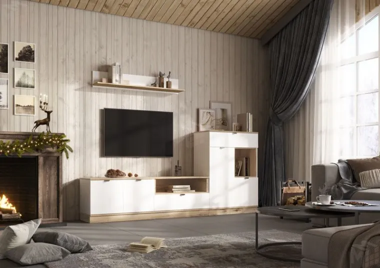 Модульная гостиная "Юкки комплект-3" изготовлена из ЛДСП в цвете белый/дуб делано.