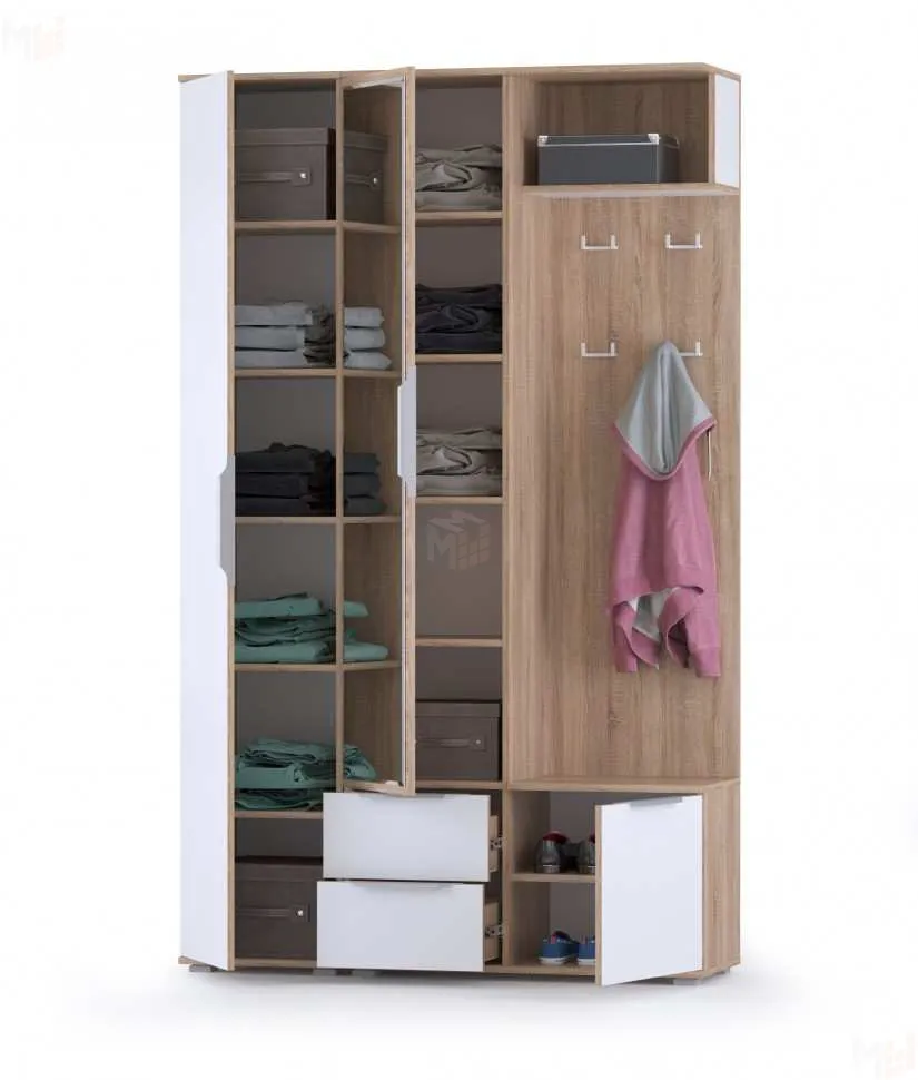 В линейке присутствуют модули с нестандартной конструкцией, повышающие вместимость.Лаконичная дизайнерская фурнитура идеально дополняет внешний вид прихожей Куба.