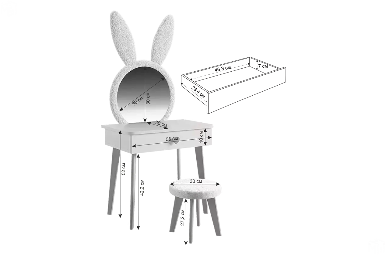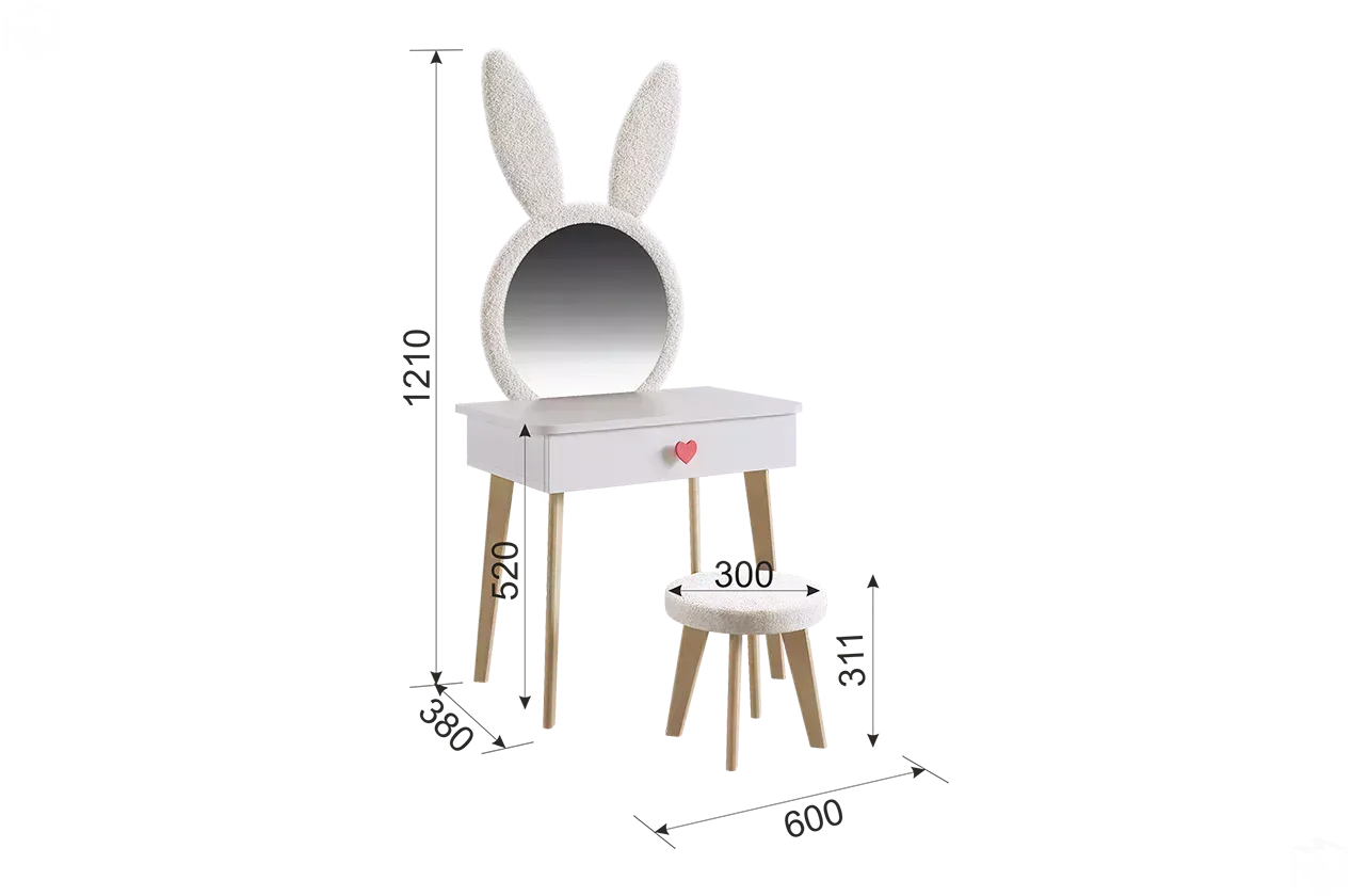 Столик-трюмо с ящиком: 1220 х 600 х 390 мм.