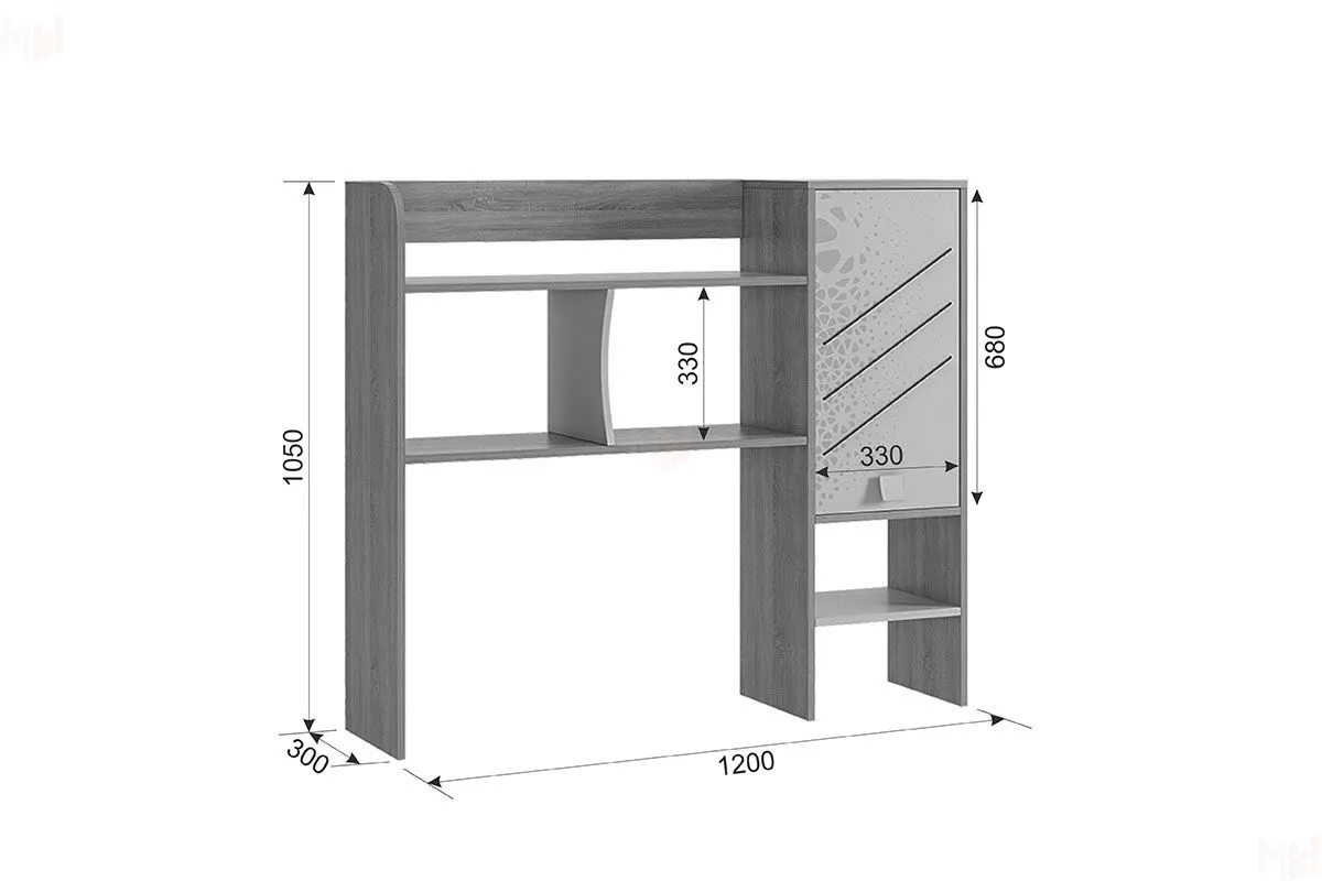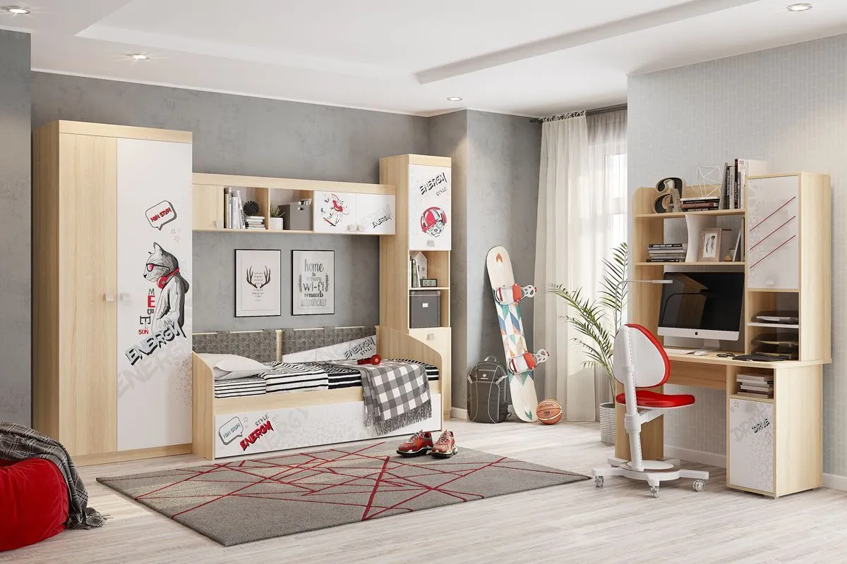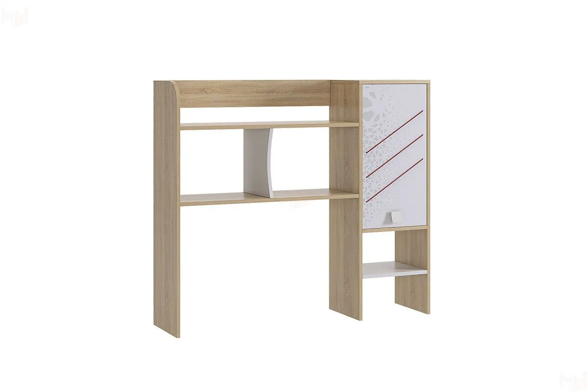 Надстройка «Энерджи» – функциональное и универсальное дополнение к столу «Энерджи». Вместительные полки предназначены для книг, учебников и папок, более того, на них можно разместить сканер или принтер. Фасад закрытой ниши с полками и принтерным рисунком. Особенностью данного модуля являются, эластичные шнуры на фасаде, под которые легко можно разместить рисунки и записки, меняя декор и настроение в комнате каждый день. -