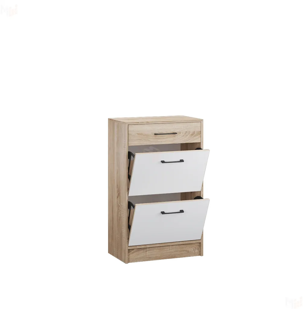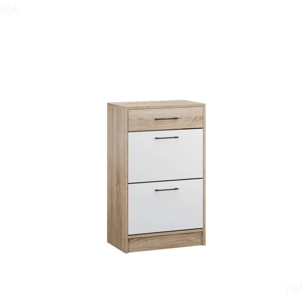 Обувница Денвер станет незаменимым элементом для обустройства уютной и достаточной приветливой прихожей. Изделие поможет раз и навсегда забыть о проблеме разбросанной обуви на полу. Модель оснащена двумя откидными дверцами со специальными отсеками для аккуратного размещения различных видов обуви. Небольшой выдвижной ящик пригодится для различных аксессуаров и мелких предметов. -