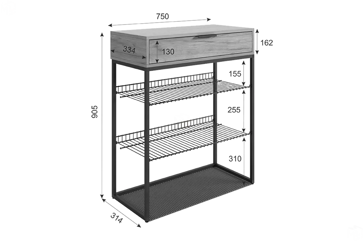 Ширина 750 мм х Глубина 334 мм х Высота 905 мм