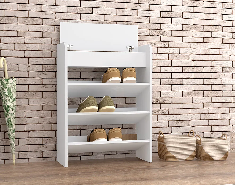 Небольшая удобная обувница оснащена тремя открытыми отделениями для обуви.