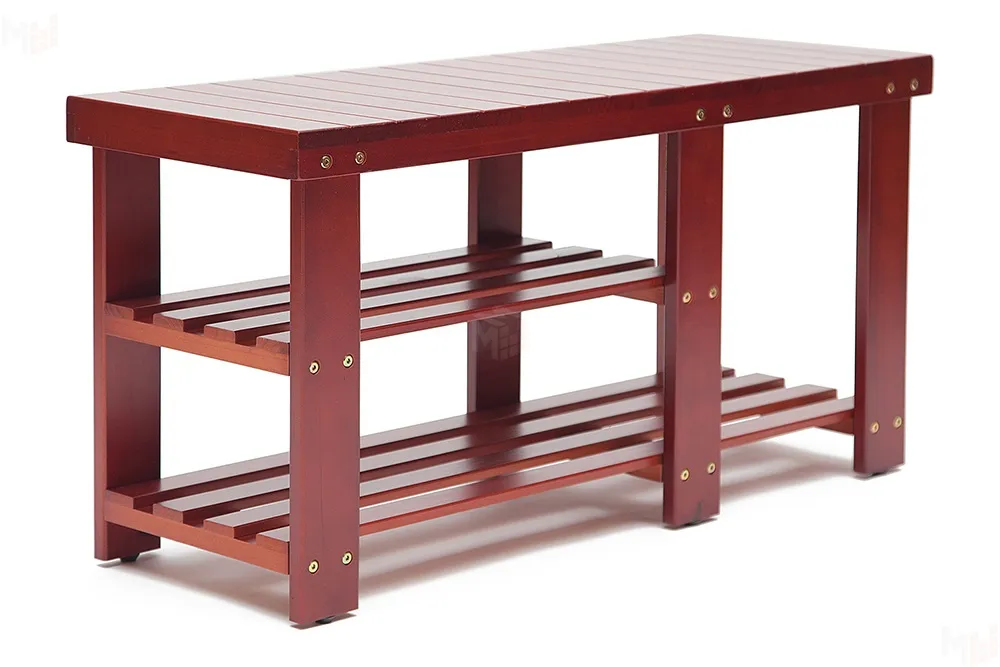 Обувница-скамья для прихожей. Модель выполнена из натурального дерева. Материалы, использованные при изготовлении данной модели, обеспечивают высокую прочность и долгий эксплуатационный срок. Наличие двух полок позволяет разместить много пар обуви.