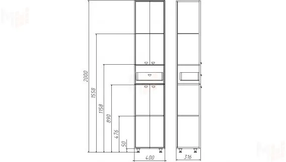 ширина 400 мм, глубина 316 мм, высота 2000 мм