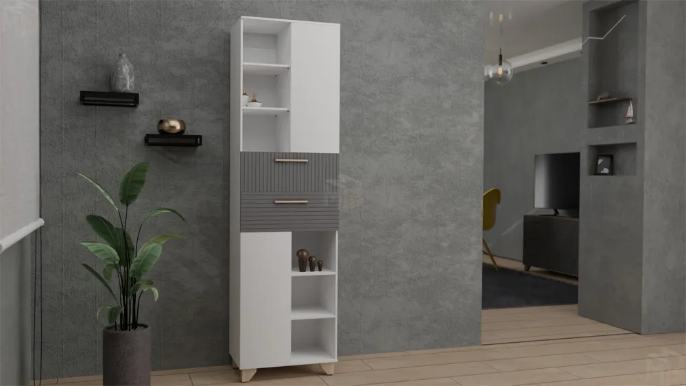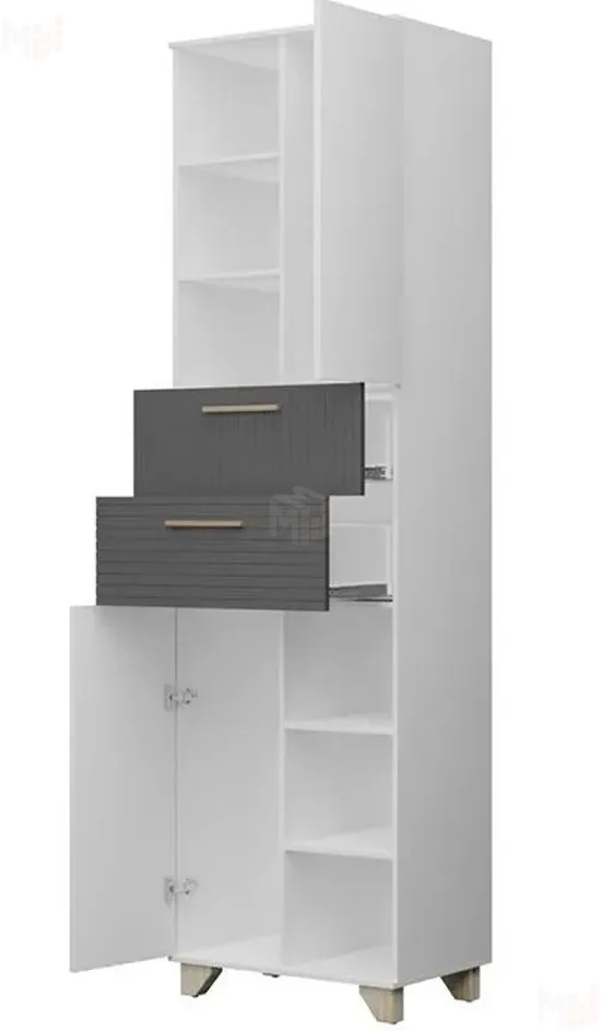 Шкаф-пенал — это отличный функциональный элемент для гостиной. Пенал оснащен открытыми полками и полками со створками, что позволяет хранить и предметы декора, и личные вещи, документы. Для плавности хода створок петли оснащены доводчиками. В конструкции пенала имеются ящики, оснащенные шариковыми направляющими полного выдвижения. Современная система «push-to-open» позволяет открывать створки нажатием руки. Ящики оснащены ручками из натурального массива дуба. Ножки, выполненные из массива дерева, имеют регулировку по высоте. Выбор цветов корпуса и фасада позволит найти удачный вариант для интерьера. -