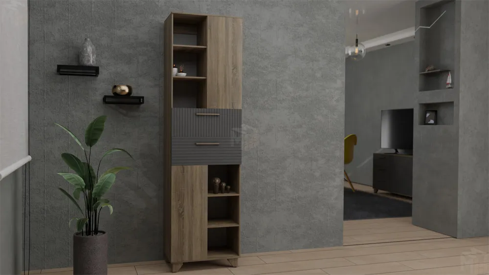 Шкаф-пенал — это отличный функциональный элемент для гостиной. Пенал оснащен открытыми полками и полками со створками, что позволяет хранить и предметы декора, и личные вещи, документы. Для плавности хода створок петли оснащены доводчиками. В конструкции пенала имеются ящики, оснащенные шариковыми направляющими полного выдвижения. Современная система «push-to-open» позволяет открывать створки нажатием руки. Ящики оснащены ручками из натурального массива дуба. Ножки, выполненные из массива дерева, имеют регулировку по высоте. Выбор цветов корпуса и фасада позволит найти удачный вариант для интерьера. -