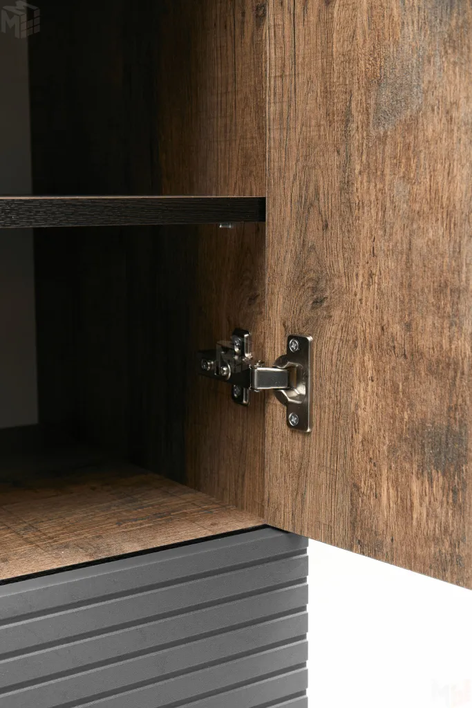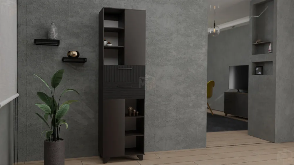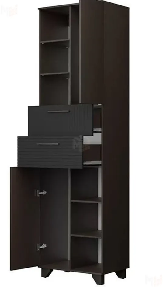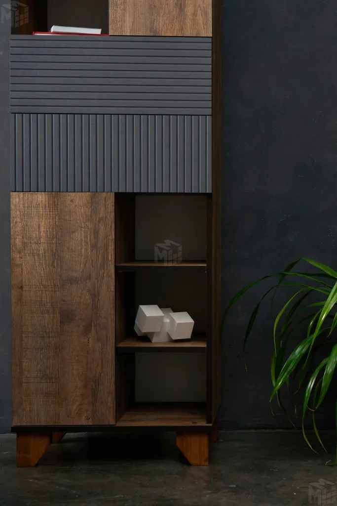 Шкаф-пенал — это отличный функциональный элемент для гостиной. Пенал оснащен открытыми полками и полками со створками, что позволяет хранить и предметы декора, и личные вещи, документы. Для плавности хода створок петли оснащены доводчиками. В конструкции пенала имеются ящики, оснащенные шариковыми направляющими полного выдвижения. Современная система «push-to-open» позволяет открывать створки нажатием руки. Ящики оснащены ручками из натурального массива дуба. Ножки, выполненные из массива дерева, имеют регулировку по высоте. Выбор цветов корпуса и фасада позволит найти удачный вариант для интерьера. -
