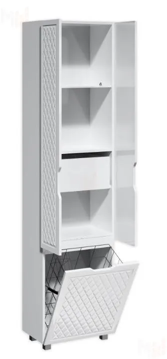 В верхнем отсеке пенала три полки и один выдвижной ящик, нижний отсек предназначен для корзины для грязного белья.