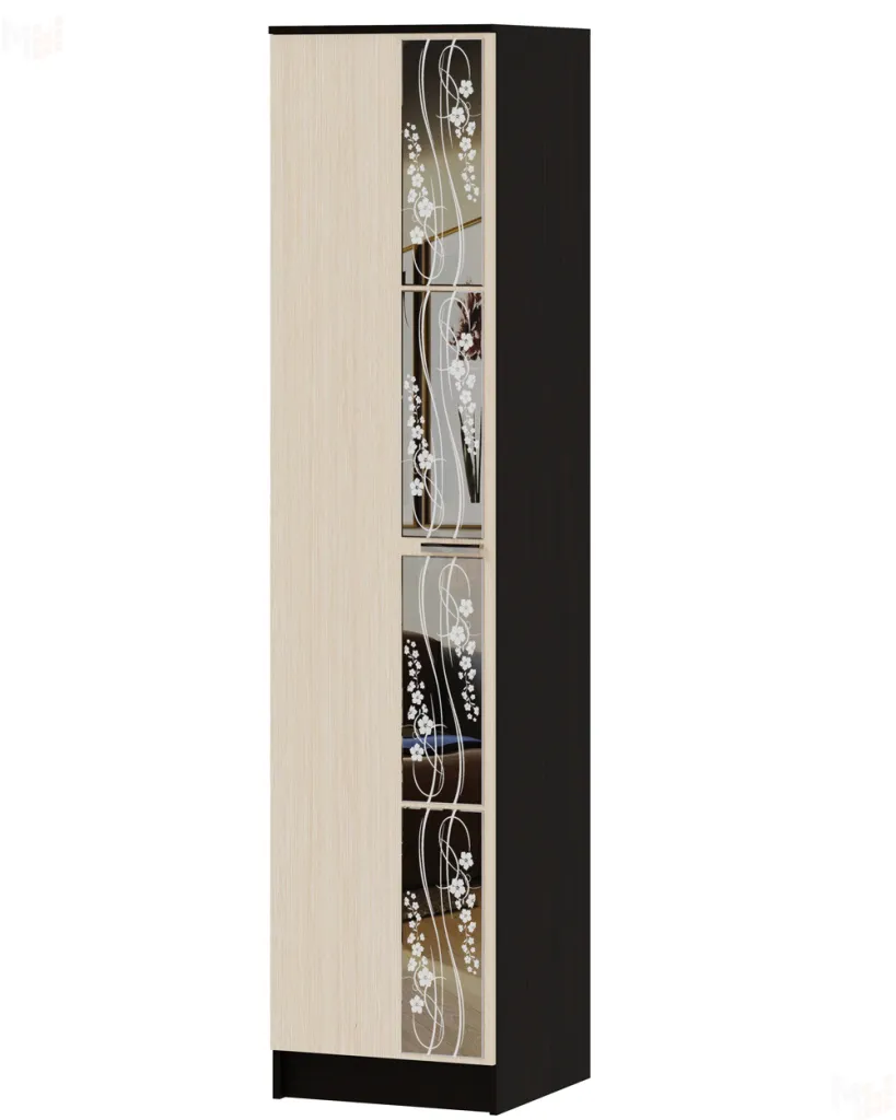 Пенал СП-500 Сабина с полками и зеркалами. Фасад облицован зеркалами с пескоструйным орнаментом, повторяющимся во всех элементах системы.