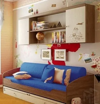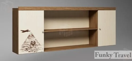 Полка в детскую Фанки Тревел имеет размеры, совпадающие с шириной кровати из серии Фанки Тревел. Фасад одной из дверок украшен фотопечатью с изображением пирамиды и сфинкса.
