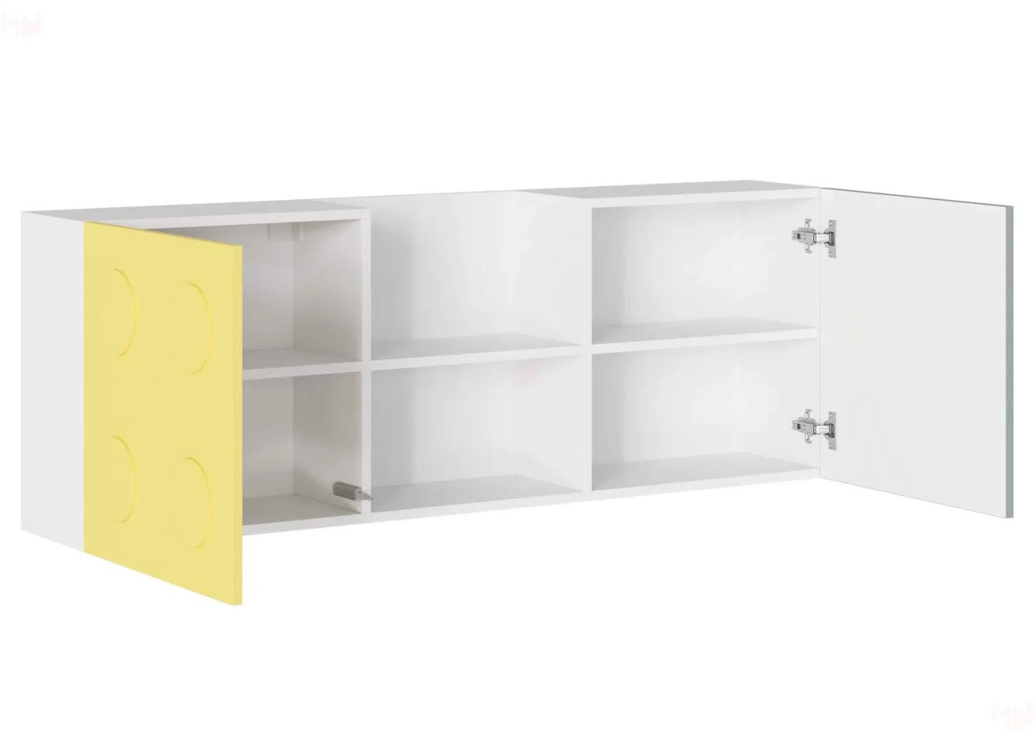 Одна створка открывается при помощи оригинальной ручки КУБО,изготавливаемой на нашем производстве из МДФ 16мм в пленке ПВХ Белый глянец.
