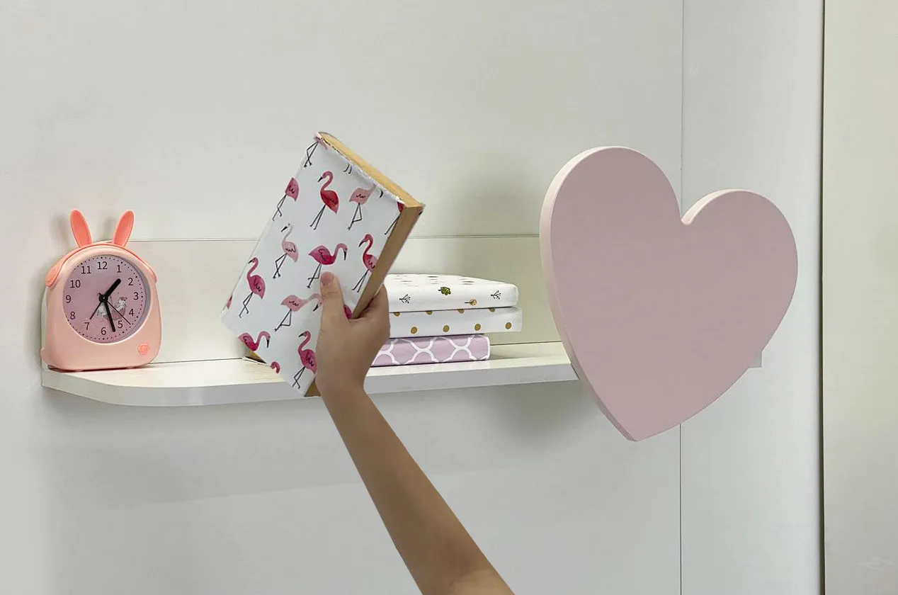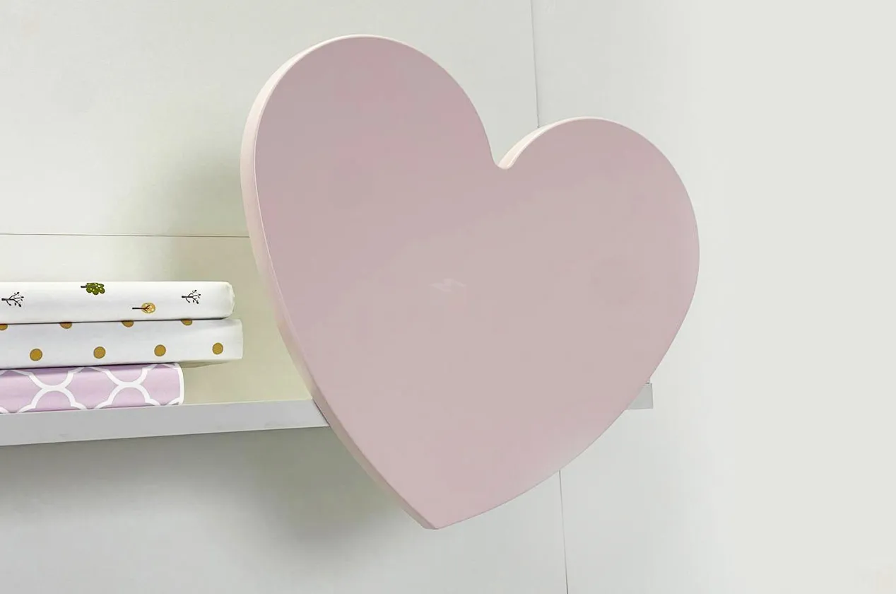 - Материалы: ЛДСП в цвете белого дерева, декоративный элемент из МДФ в форме сердечка, покрытый розовой матовой эмалью