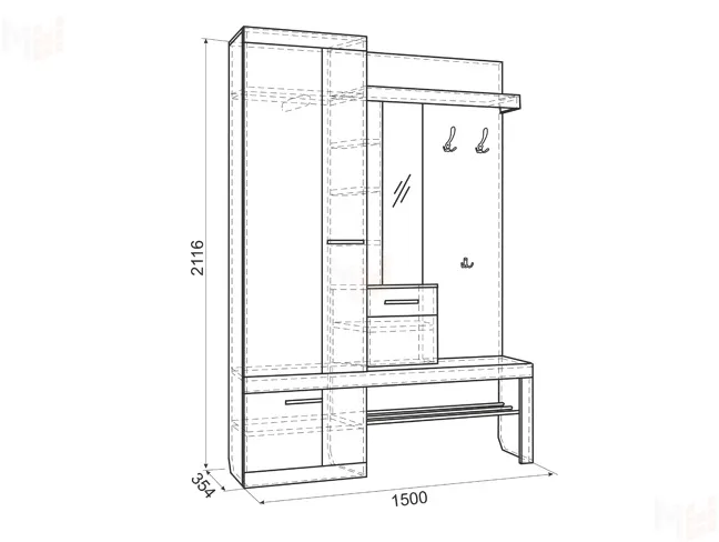 Ширина 1500 мм, глубина 351 мм, высота 2116 мм