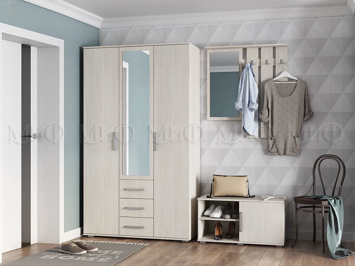 Компактная прихожая Белла-2 состоит из трех независимых моделей: вешалка с зеркалом, тумба, шкаф 3-х дверный.