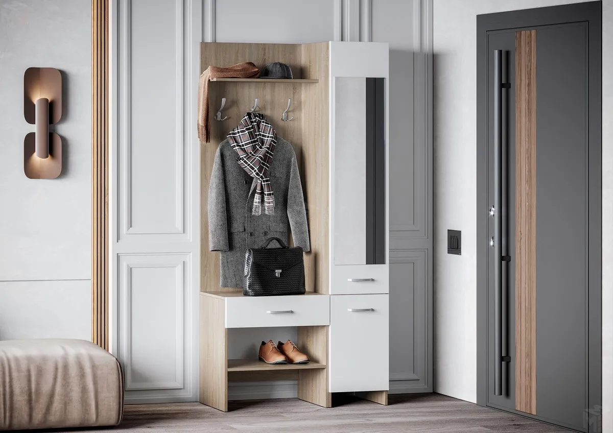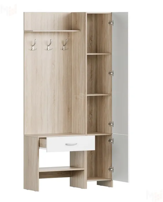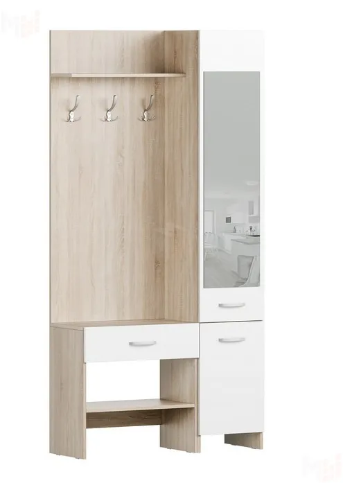 Прихожая "Домино" - отличный выбор для Вашего дома! Контрастные цвета - дуб сонома и белый - будут отлично выглядеть в прихожей. Удобство и функциональность конструкции не оставят Вас равнодушными: зеркало, пенал, ящики и полки - как открытых, так и находящихся за распашной дверцей.