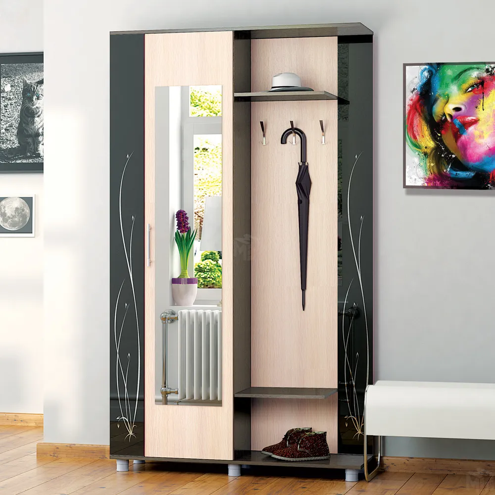 Функциональная и компактная прихожая Ирма 2 отличный вариант для малогабаритных квартир. Она включает в себя вместительный шкаф со штангой, полку для мелочей, на которой можно разместить перчатки, кошельки и ключи. На дверце шкафа предусмотрено зеркало. Открытая секция с крючками под одежду и зонты отлично дополняет комплект. -