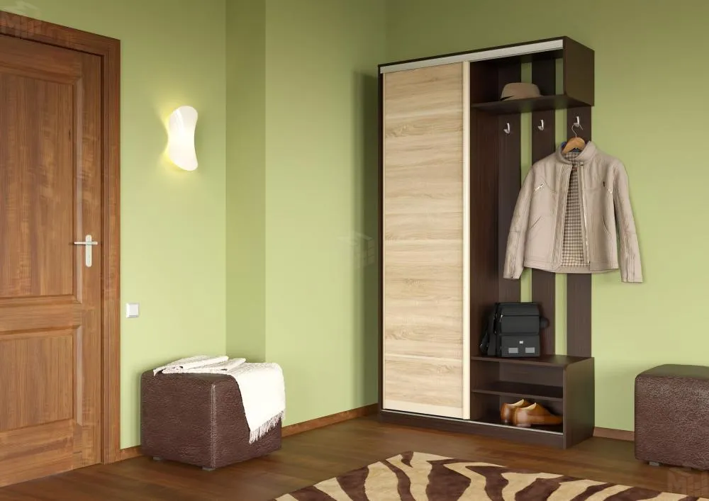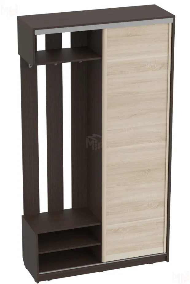 Прихожая Леон обладает небольшими габаритами, но в ней есть все, что требуется от данного предмета мебели. Предусмотрена полочка для головных уборов и обуви, закрываемый шкаф и крючки для верхней одежды.