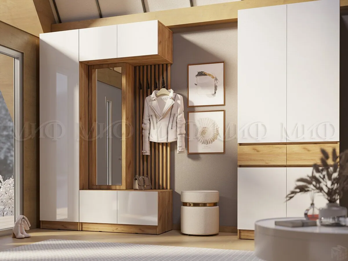 Прихожая состоит из навесной антресоли,напольной тумбы, пенала с полками за зеркальной дверью и МДФ-профилей с крючками для одежды.
