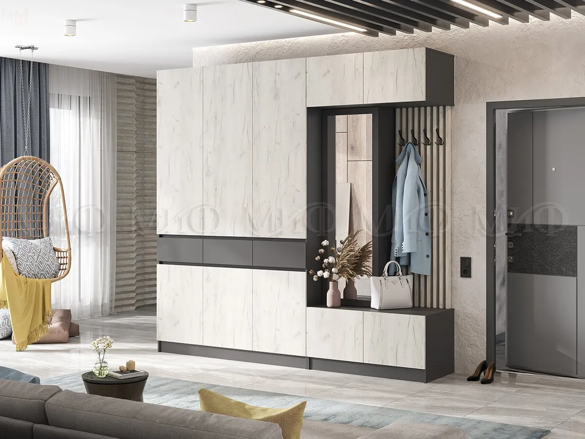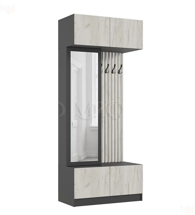 Прихожая состоит из навесной антресоли,напольной тумбы, пенала с полками за зеркальной дверью и МДФ-профилей с крючками для одежды.