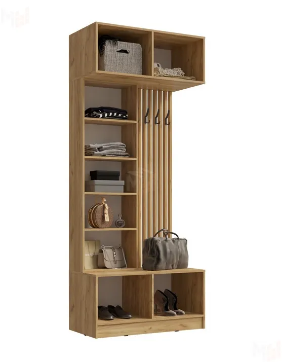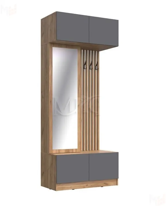 Прихожая состоит из навесной антресоли,напольной тумбы, пенала с полками за зеркальной дверью и МДФ-профилей с крючками для одежды.
