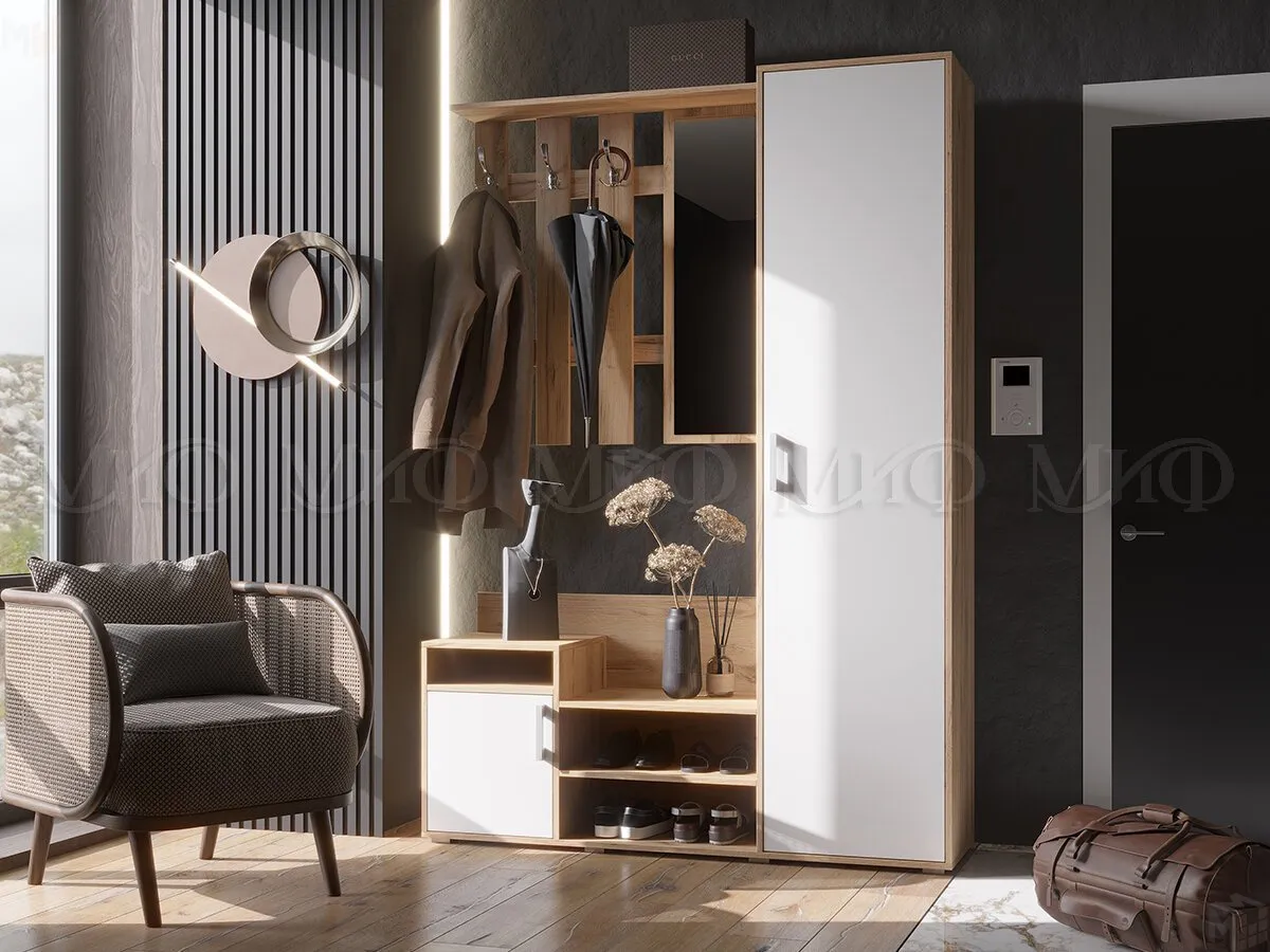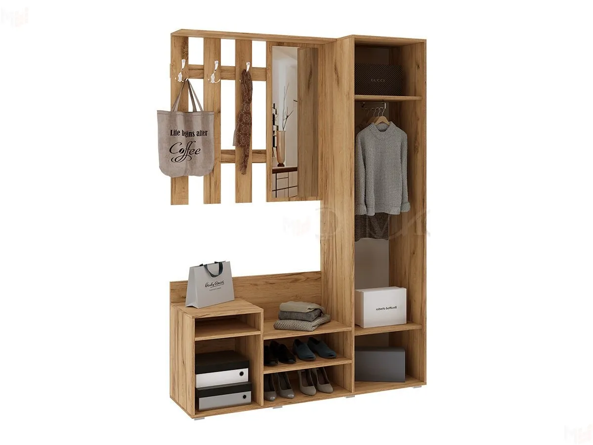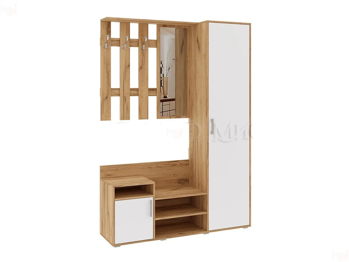 В набор входит тумба для обуви, вешалка, шкаф для одежды.