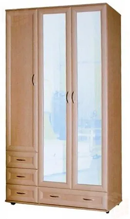 Шкаф распашной с двумя створками имеет 2 полки - вверху и внизу, и штангу для одежды, под шкафом - широкий выдвижной ящик. Секция с одной створкой имеет 5 полок и 3 выдвижных ящика снизу.