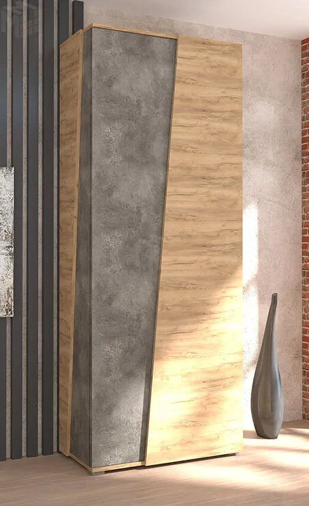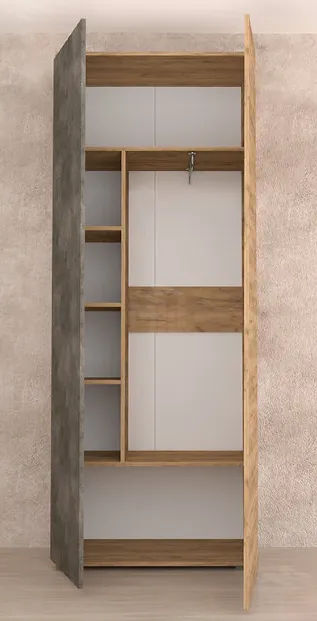 Внутри располагается выдвижная штанга для одежды, антресольная и нижняя полки по всей ширине, отделение с полками.