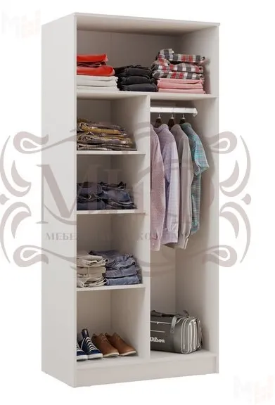 Шкаф разделен на 2 части: полки и штанга для одежды. Цвет венге/беленый дуб.