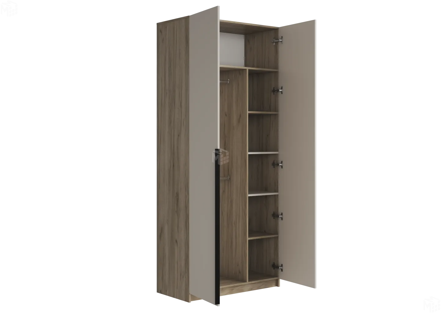 Шкаф имеет антресольную полку (высота 370 мм) и оставшееся снизу неё пространство, поделённое перегородкой на: