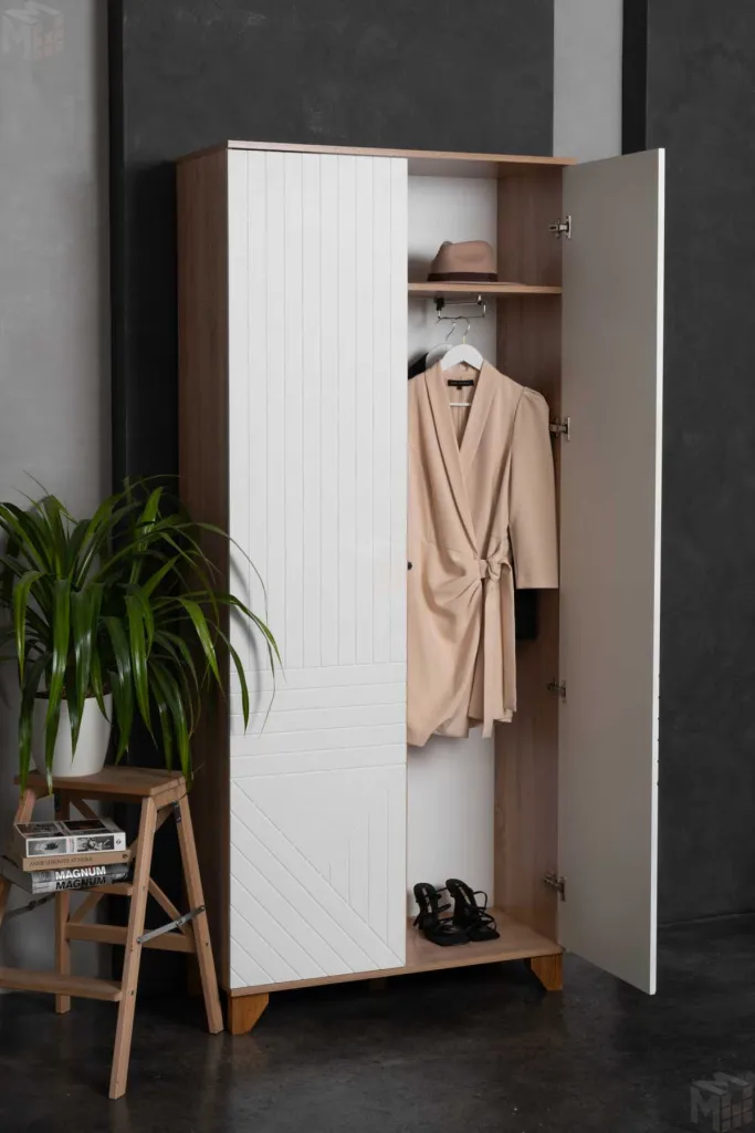 Шкаф Копенгаген подходит для хранения вещей как на вешалках, так и в сложенном виде. Для этого он оснащен штангой и комплектом щитовых полок. Петли с доводчиком обеспечивают плавность хода при открывании и закрывании, а ручки из массива дуба придают шкафу приятный стиль. Ножки выполнены из массива дерева с регулировкой по высоте. Сочетание расцветки корпуса и фасада позволит найти идеальный вариант для любого интерьера. -