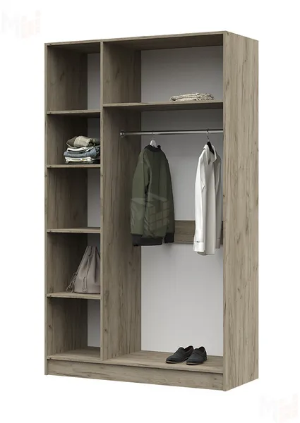 Наполнение: одна секция с 4 полками, другая со штангой для одежды и верхней полкой для мелких вещей