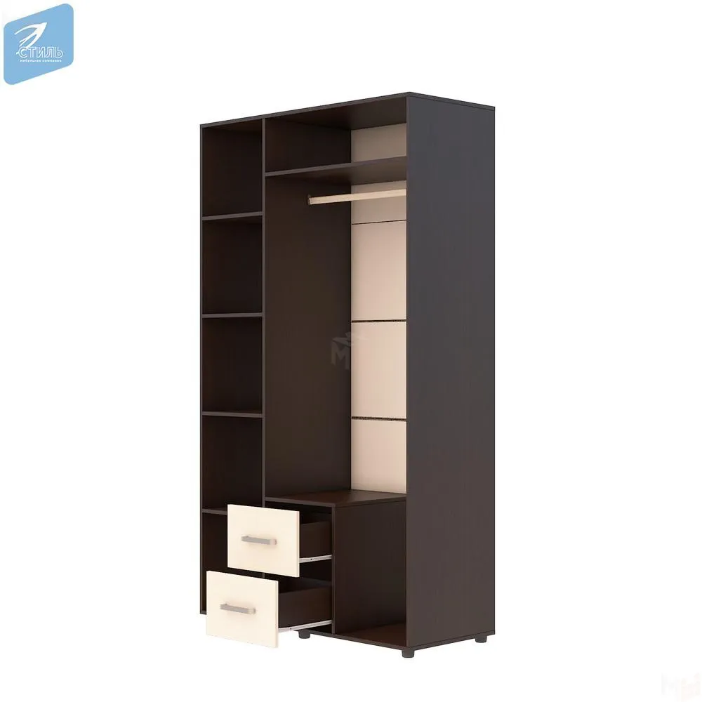 Шкаф разделен на две зоны для хранения. Слева располагаются четыре полки для хранения белья. Справа размещена металлическая штанга для хранения верхней одежды. Над штангой расположена полка. Центральная створка без ручки, открывается после открытия основной правой створки.
