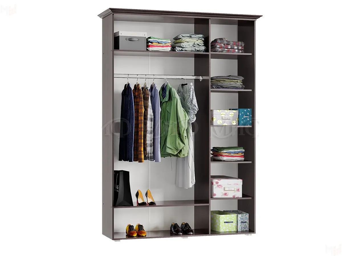 Наполнение шкафа - слева секция с полками для белья, справа отделение со штангой для верхней одежды, полка в верхней и нижней части шкафа.