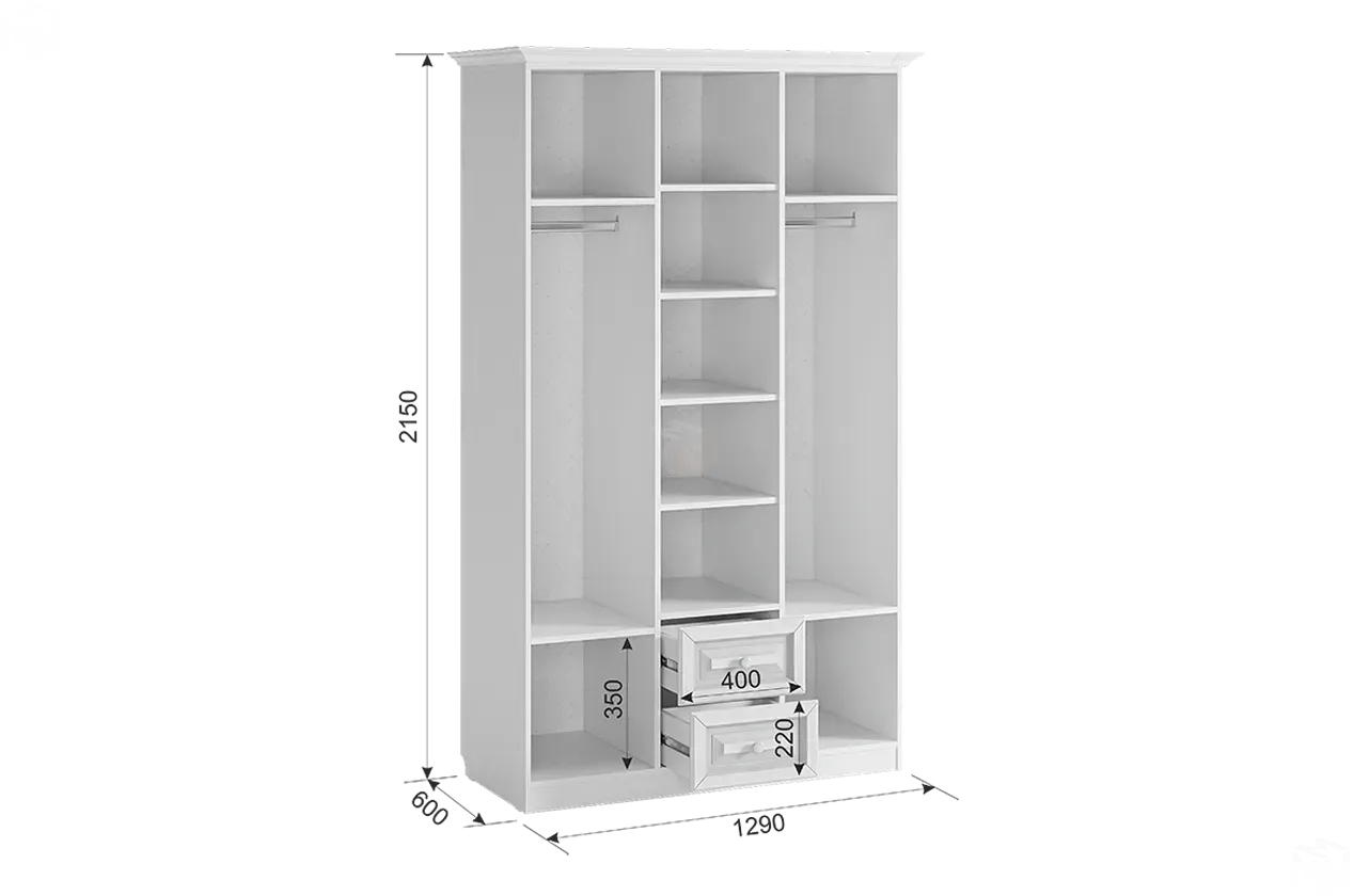 Состоит из: отделения с полками, 2-х отделений со штангой для одежды, 2-х выдвижных ящиков.