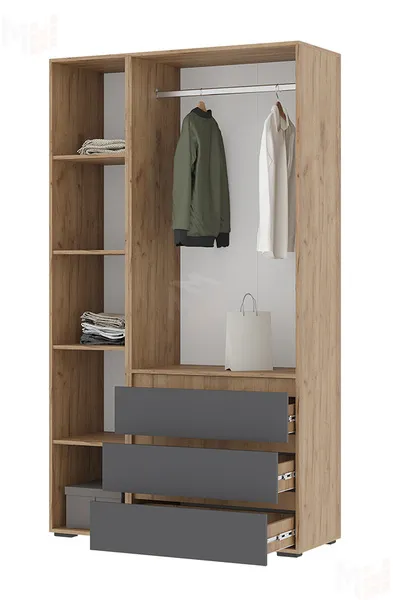 Шкаф оснащен тремя дверцами, за которыми располагается достаточно места для хранения одежды и различных предметов. Три вместительных выдвижных ящика.