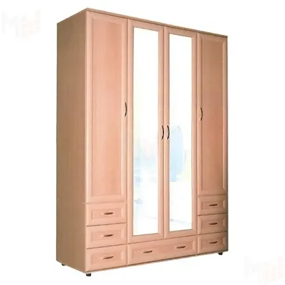 В многообразии шкафов, предлагаемых потребителю, особой эргономичностью отличается модель №157. В его конструкции много полок и ящиков, а так же отделение для верхней одежды. Эта модель представляет собой оригинальное сочетание шкафа и комода. Разделённый на три секции он имеет четыре створки. Средняя двухстворчатая секция предназначена для аккуратного развешивания одежды на «плечики». Дополнительно она снабжена антресольной полкой и полкой для обуви. Внизу этой секции находится выдвижной ящик. Наружные панели дверей отделаны зеркалами в рост человека, что позволяет рассмотреть ваш наряд со всех сторон. Две крайние одностворчатые секции заполнены полками, удобными для хранения белья. В нижних частях боковых секций находится по три ящика, снабжённых роликовыми направляющими.