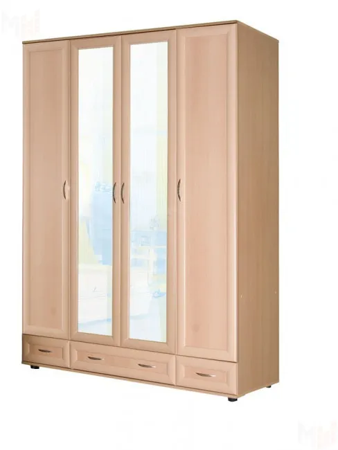 Этот шкаф 4-х створчатый, дверцы декорированы резными вставками, две имеют зеркала. Модель состоит из трёх секций. В большой центральной, которая скрывается за двумя зеркальными дверьми, располагается встроенная перекладина для вешалок, две полки для головных уборов и обуви и просторный выдвижной ящик внизу. В двух боковых секциях находятся вместительные полки для одежды и выдвижные ящики меньшего размера. Шкаф не вызывает трудностей в сборке и удобен в эксплуатации.