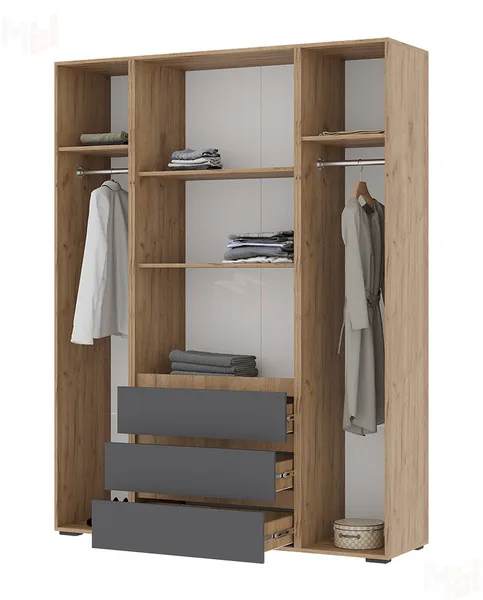 Шкаф оснащен четырьмя дверцами, за которыми располагается достаточно места для хранения одежды и различных предметов. Три вместительных выдвижных ящика. -