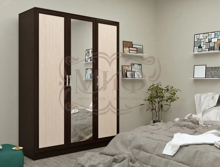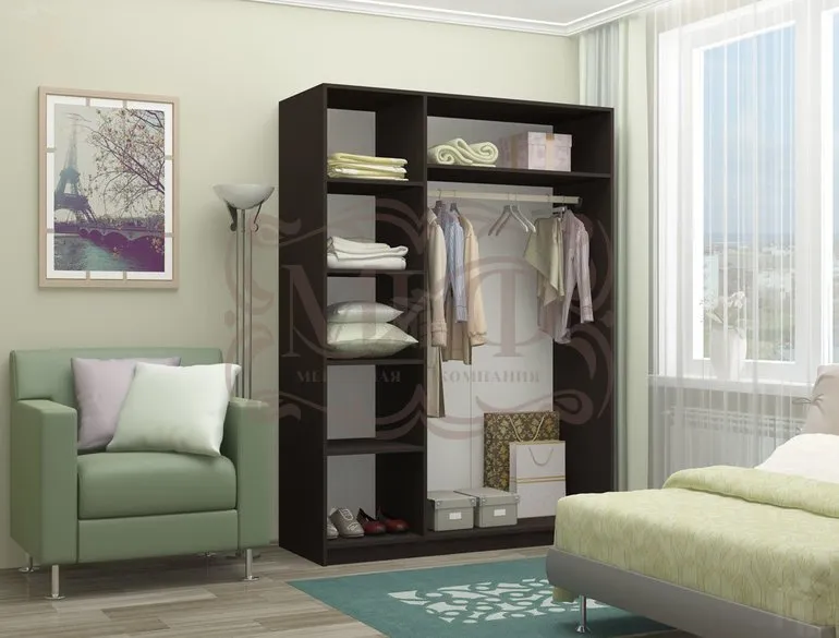 Наполнение шкафа: слева полки для белья, справа две трети шкафа занято штангой для верхней одежды + верхняя полка. Цвет венге/беленый дуб
