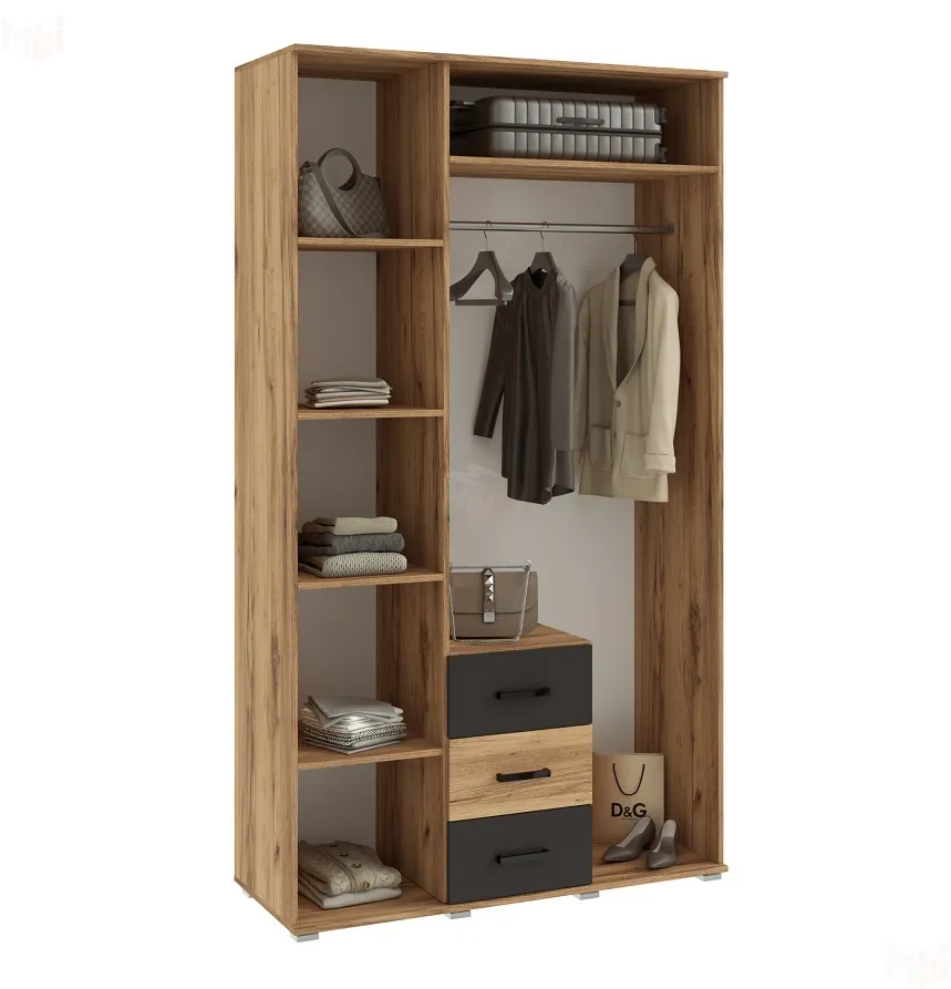 Наполнение шкафа - полки для белья, штанга для одежды, выдвижные ящики. Цвет крафт золотой/графит