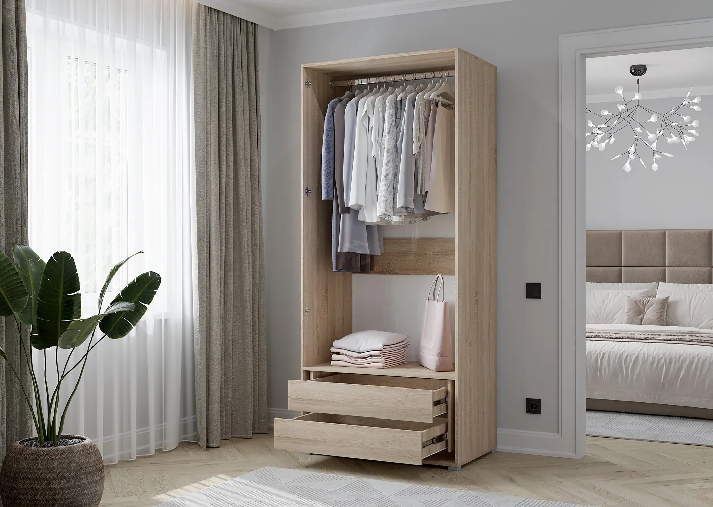 Наполнение - штанги для вешалок, выдвижные ящики.
