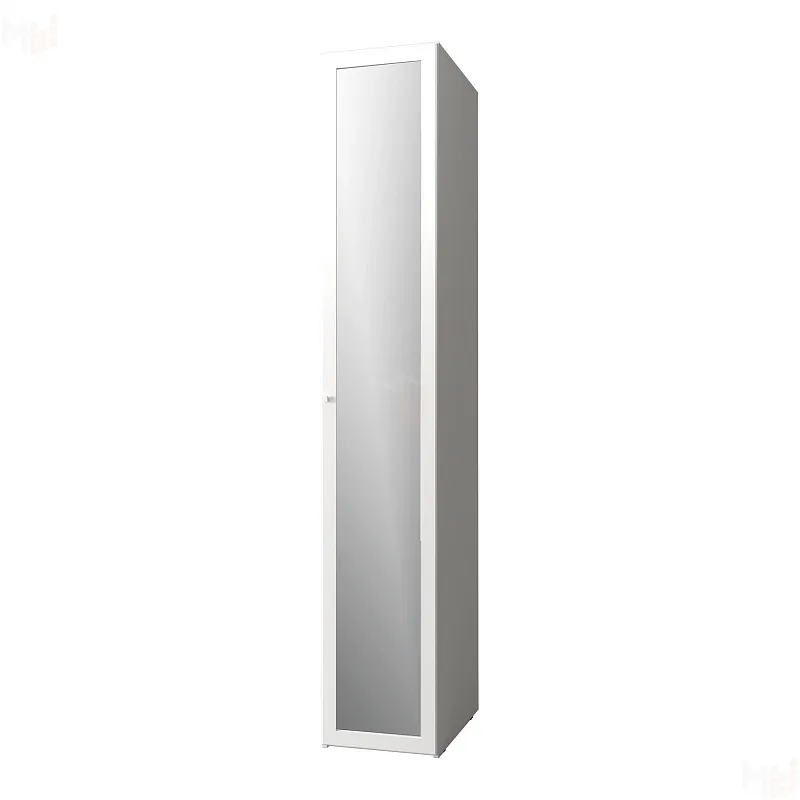 В этом варианте корпус докомплектовывается фасадом Зеркало. Зеркальная дверь выполнена в обрамлении из профиля МДФ. Шкаф обязательно крепить к стене за подвесы.Зеркало проклеено сзади специальной пленкой