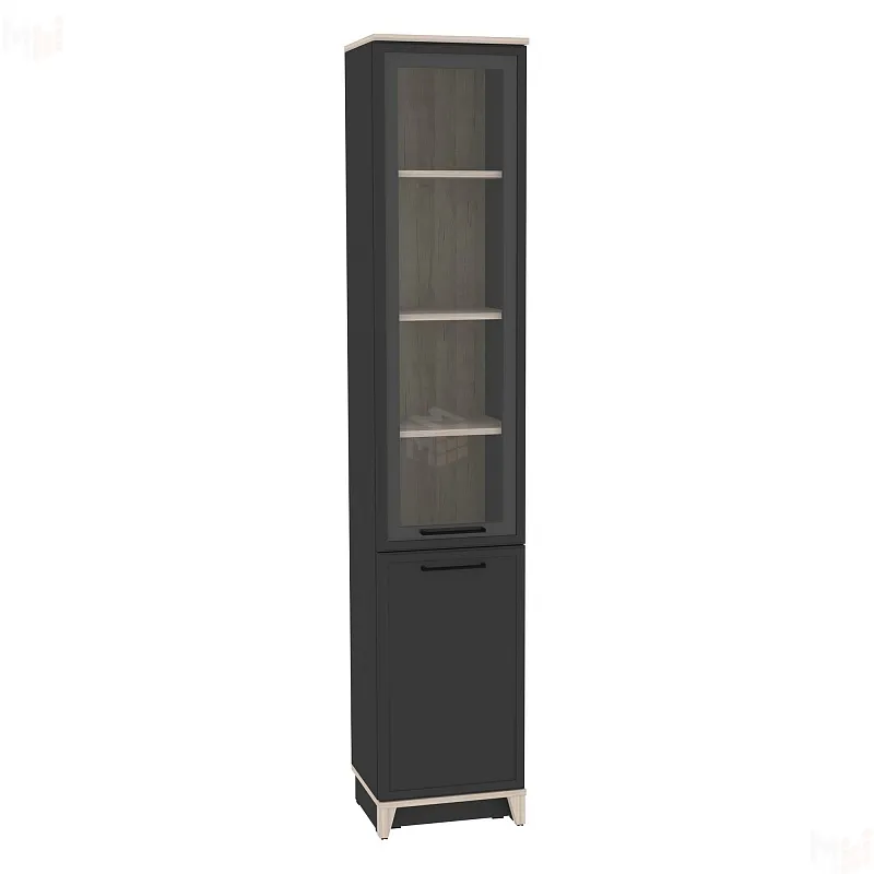 Неглубокий (355 мм) шкаф для книг позволяет разместить любимые книги за прозрачным стеклом, а архив за глухим фасадом. Изысканность стиля подчеркивает тонкий фигурный профиль на фасадах, верх и низ модулей выполнены в древесном декоре, а скошенные опоры из МДФ добавляют мебели в стиле неоклассика из коллекции AURELIO нотку современной эстетики.