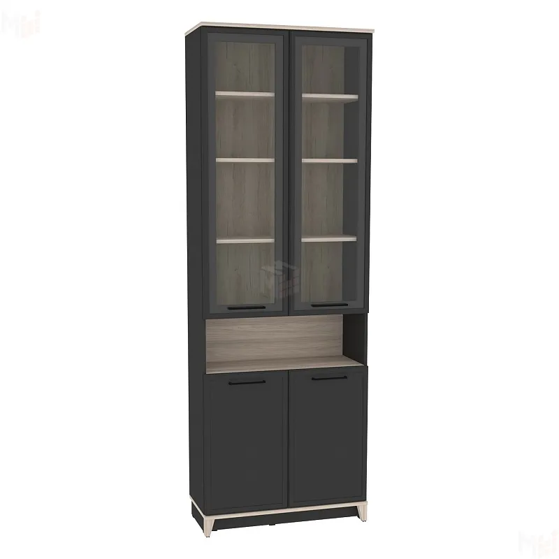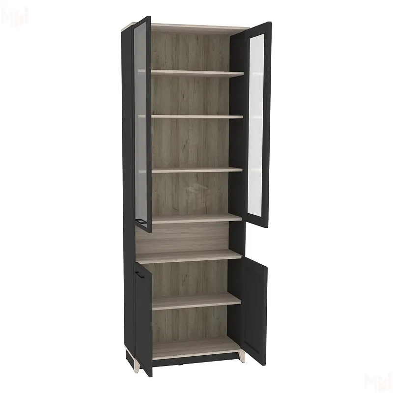 Высокий (2308 мм) и неглубокий (355 мм) двухдверный шкаф для книг помогает разместить любимые книги за прозрачным стеклом, а архив - за глухим фасадом. Изысканность стиля подчеркивает тонкий фигурный профиль на фасадах, верх и низ шкеафа выполнены в древесном декоре, а скошенные опоры из МДФ и чёрные металлические ручки добавляют мебели в стиле неоклассика из коллекции AURELIO нотку современной эстетики.